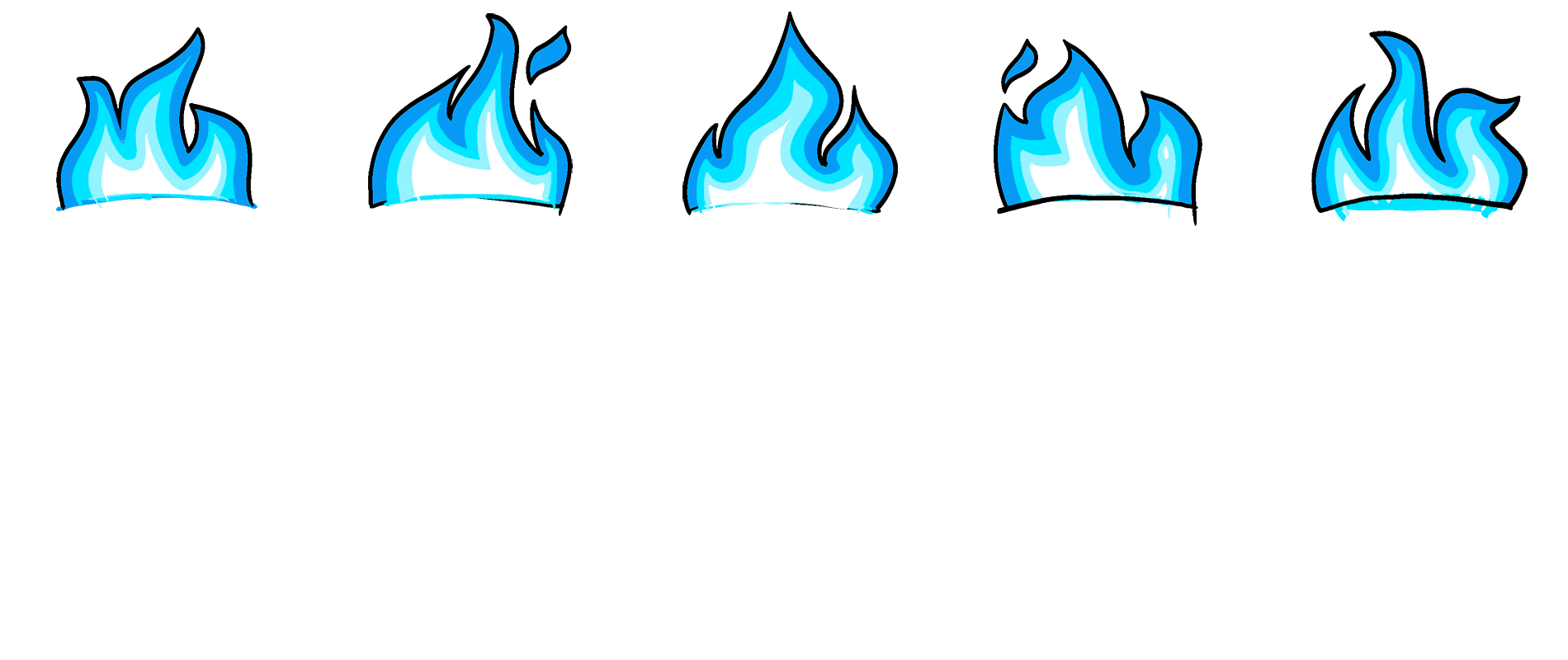 To produce the illusion that the fire is flickering, I drew five different versions of the blue flames. These frames are stacked side-by-side in a single image known as a “spritesheet”: